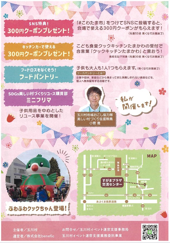 平素より当施設をご利用いただきありがとうございます。 「春のこわたま市2026」開催についてお知らせいたします。 日時:2026年3月20日(金・祝日)10:00~15:00 場所:すがまプラザ交流センター 福島県石川郡玉川村南須釜字奥平290(旧 須釜中学校) (コワーキングスペースたまかわ) ※雨天決行。室内でお楽しみいただけます。 今回も盛りだくさんな内容になっております。 ・ハンドメイド雑貨・工芸品 ・ワークショップ ・ふわふわクックちゃんドーム ・SDGsミニフリーマーケット ・凍頂烏龍茶試飲会 ・クックちゃん文庫 ・フードパントリー ・玉川村地域おこし協力隊ブース ・キッチンカー など 入場特典① \SNS特典 300円クーポンプレゼント!/ SNSに「#こわたま市 」をつけて投稿すると、当日会場で使用できる300円クーポンをプレゼント! (先着50名 なくなり次第終了) 入場特典② \キッチンカーで使える300円クーポンプレゼント!/ こども食堂「クックキッチンたまかわ」(@c.kitchen.tamakawa )では、「クックキッチンたまかわ」の合言葉で、高校生以下対象に当日キッチンカーで使用できる300円クーポンプレゼント! (先着30名 なくなり次第終了) 入場特典③ \フードパントリー/ フードロス削減の取り組みとして、食品の無料配布を行います。 おひとり1つ選べます! (なくなり次第終了) ※出店者の情報は 「玉川村イベント運営支援事業」のInstagramをご確認ください。 【主催者】 玉川村(イベント運営支援業務委託事業) 【運営者】 株式会社benefic 【お問い合わせ先】 玉川村イベント運営支援事務局 ご家族やご友人をお誘い合わせの上、ぜひお越しください。
