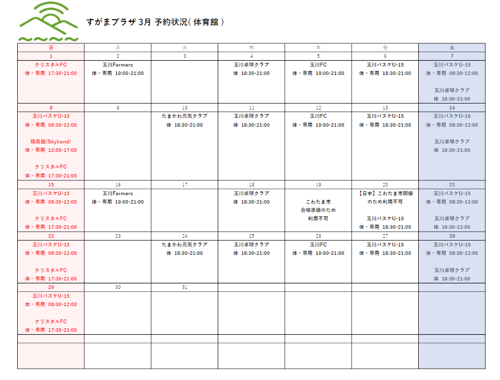 3月の体育館の予約状況をお知らせいたします。 ご利用の参考にしてみてください。 メールでのご予約も承っております。 平日の営業時間内にご連絡ください。 メール:coworkingtamakawa@gmail.com なお、月内に予約内容の変更が生じた場合でも、 その都度の掲載はいたしませんので、あらかじめご了承ください。 ※3月19日(木)及び3月20日(金・祝)は「春のこわたま市」開催に伴い、 体育館がご利用いただけません。