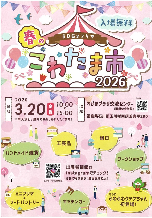 平素より当施設をご利用いただきありがとうございます。 「春のこわたま市2026」開催についてお知らせいたします。 日時:2026年3月20日(金・祝日)10:00~15:00 場所:すがまプラザ交流センター 福島県石川郡玉川村南須釜字奥平290(旧 須釜中学校) (コワーキングスペースたまかわ) ※雨天決行。室内でお楽しみいただけます。 今回も盛りだくさんな内容になっております。 ・ハンドメイド雑貨・工芸品 ・ワークショップ ・ふわふわクックちゃんドーム ・SDGsミニフリーマーケット ・凍頂烏龍茶試飲会 ・クックちゃん文庫 ・フードパントリー ・玉川村地域おこし協力隊ブース ・キッチンカー など 入場特典① \SNS特典 300円クーポンプレゼント!/ SNSに「#こわたま市 」をつけて投稿すると、当日会場で使用できる300円クーポンをプレゼント! (先着50名 なくなり次第終了) 入場特典② \キッチンカーで使える300円クーポンプレゼント!/ こども食堂「クックキッチンたまかわ」(@c.kitchen.tamakawa )では、「クックキッチンたまかわ」の合言葉で、高校生以下対象に当日キッチンカーで使用できる300円クーポンプレゼント! (先着30名 なくなり次第終了) 入場特典③ \フードパントリー/ フードロス削減の取り組みとして、食品の無料配布を行います。 おひとり1つ選べます! (なくなり次第終了) ※出店者の情報は 「玉川村イベント運営支援事業」のInstagramをご確認ください。 【主催者】 玉川村(イベント運営支援業務委託事業) 【運営者】 株式会社benefic 【お問い合わせ先】 玉川村イベント運営支援事務局 ご家族やご友人をお誘い合わせの上、ぜひお越しください。